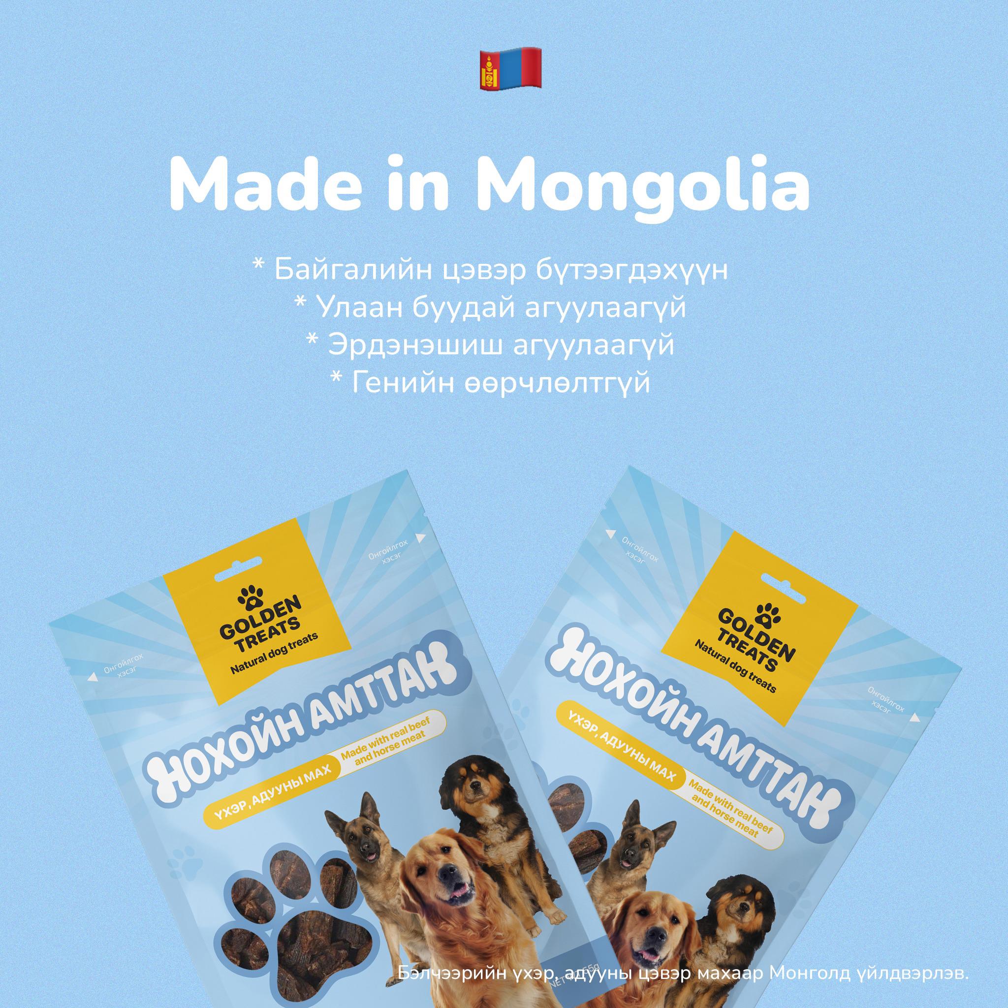 Голден трийт нь адууны мах, элэг, бөөр, чөмөг, яс, шөрмөсийг хатаасан, дээд зэргийн чанартай 100% байгалийн гаралтай нохойн амттан юм.